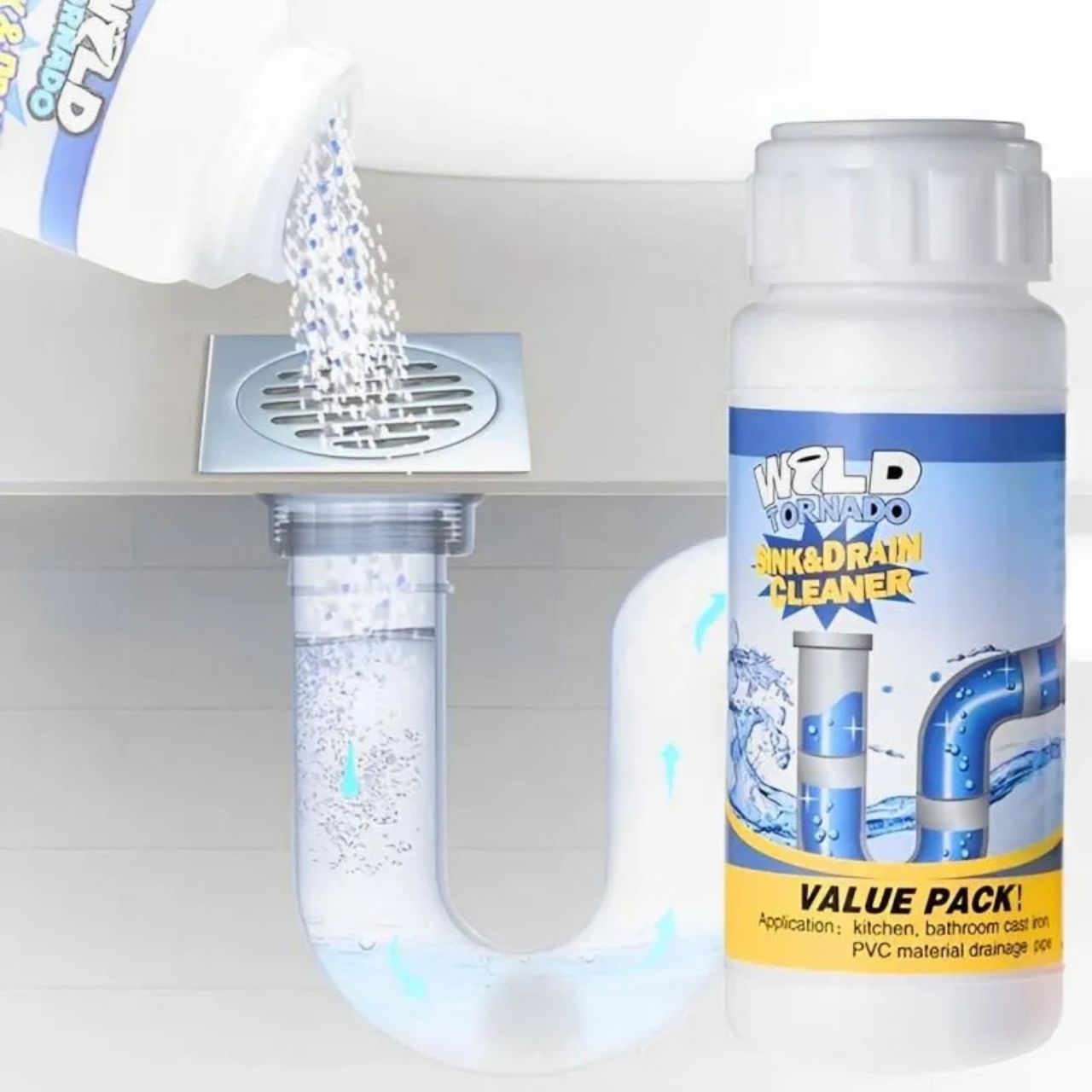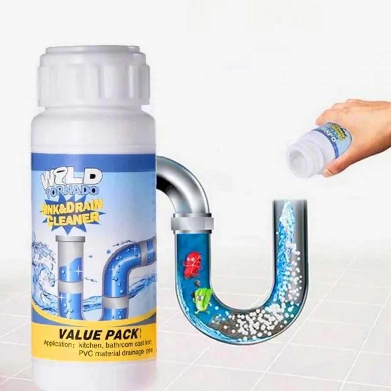 Nasypte 50 g přípravku do odpadu a propláchněte teplou vodou. Počkejte 30 minut až 1 hodinu. Poté propláchněte velkým množstvím vody.